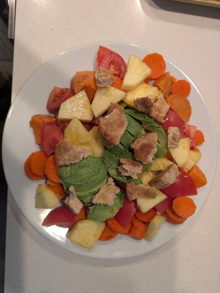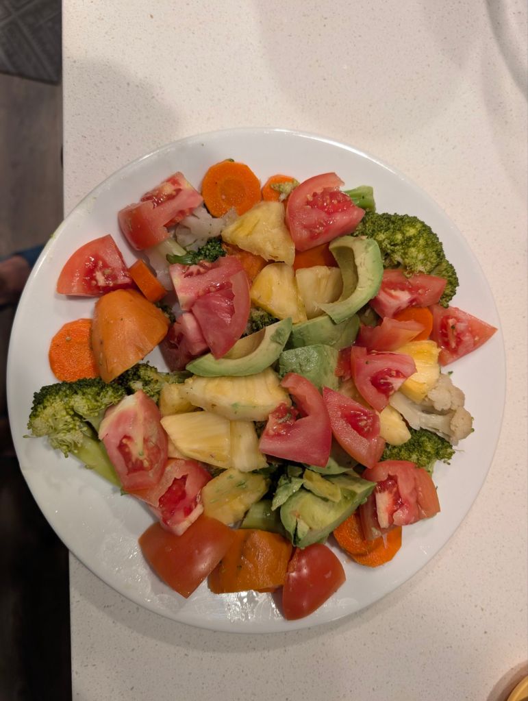 Typically mid-day, I pile a plates full of a variety of vegetables and fruits that I have cut and steamed previously. I use zero oils in preparing the vegetables. Some of the vegetables and fruits that I have used are: broccoli, cauliflower, carrots, beans, tomatoes, avocados, pineapple, sweet potatoes and lots of bell peppers and occasionally chiles. I spice it up with Cayenne pepper, black pepper and hot sauce, then microwave it. I often top it with small servings of salmon, tuna, low fat turkey or occasionally chicken. I make sure to accompany this with a glass or two of water and often follow it up with a coffee.