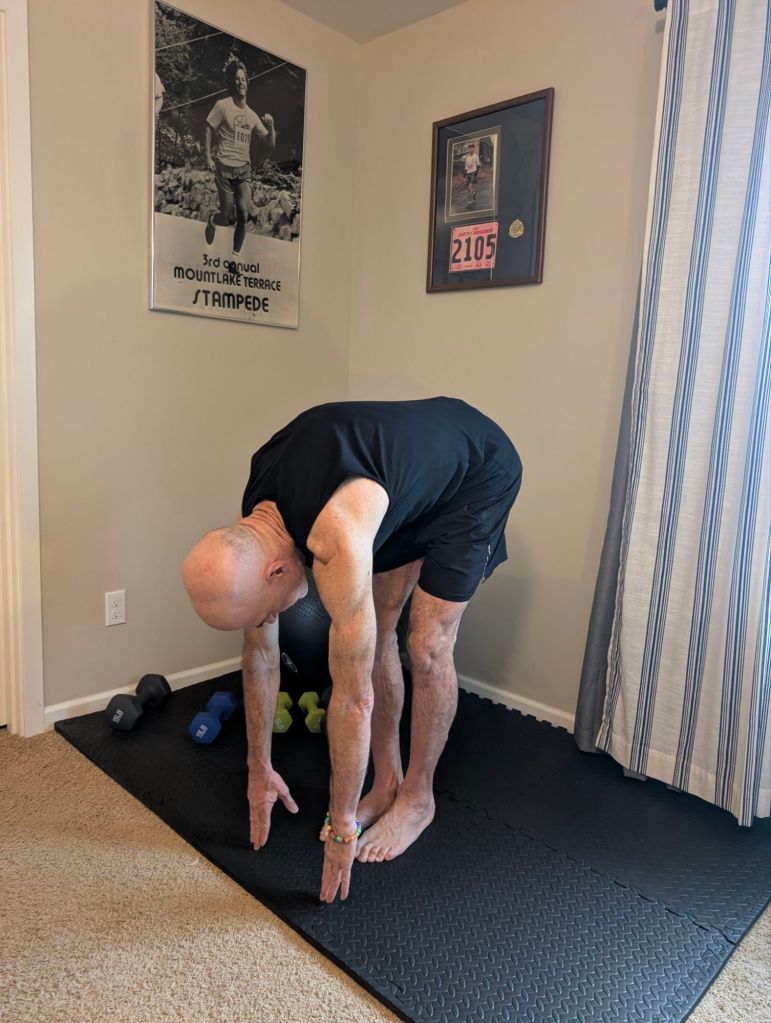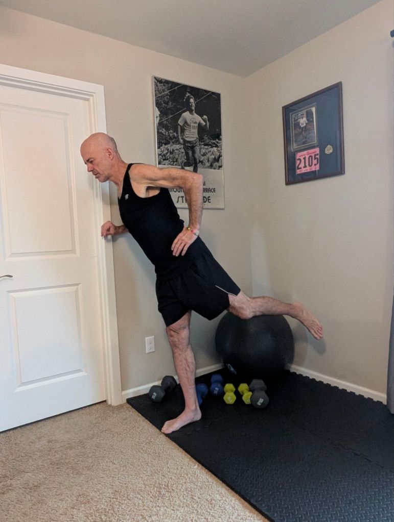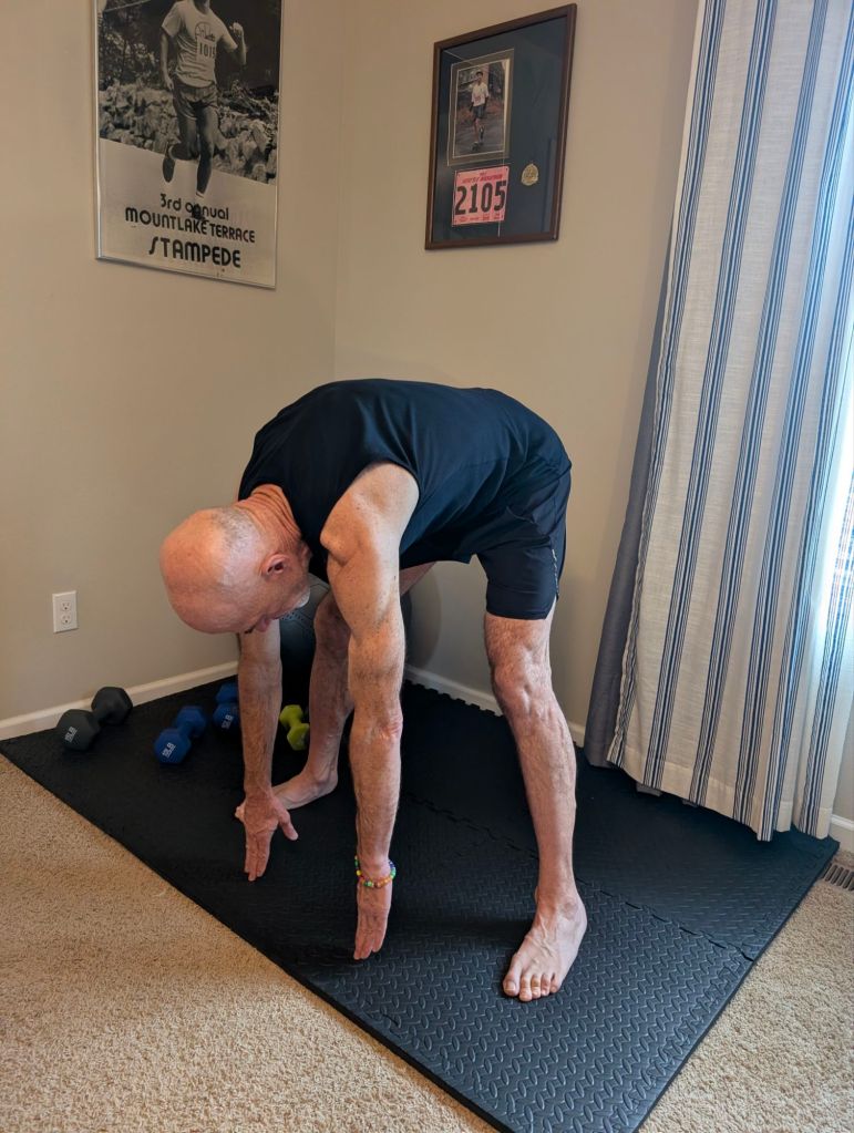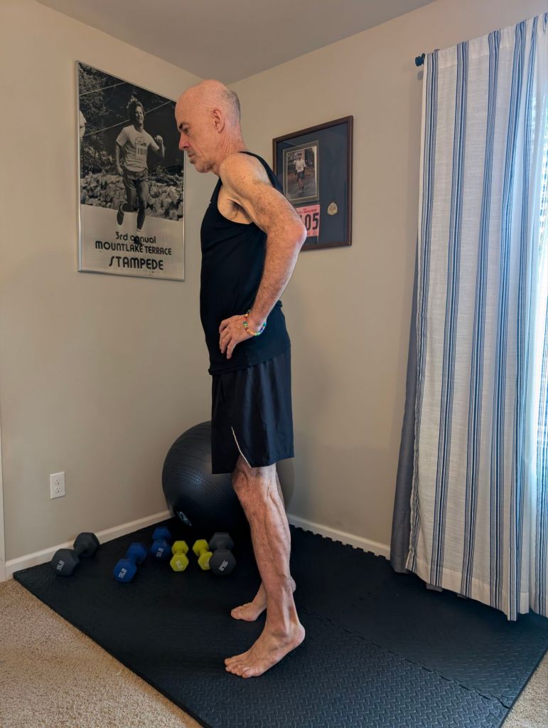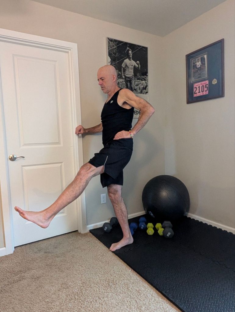 Many of these exercises combine those aims. flexibility and range of motion or balance and strength and so on. I will include photos of many of these exercises, but will attempt to describe them in words first to outline my routine. I attempt to do these things at approximately the same time as the power of habit, which I will detail later, makes all of this much easier and more sustainable.