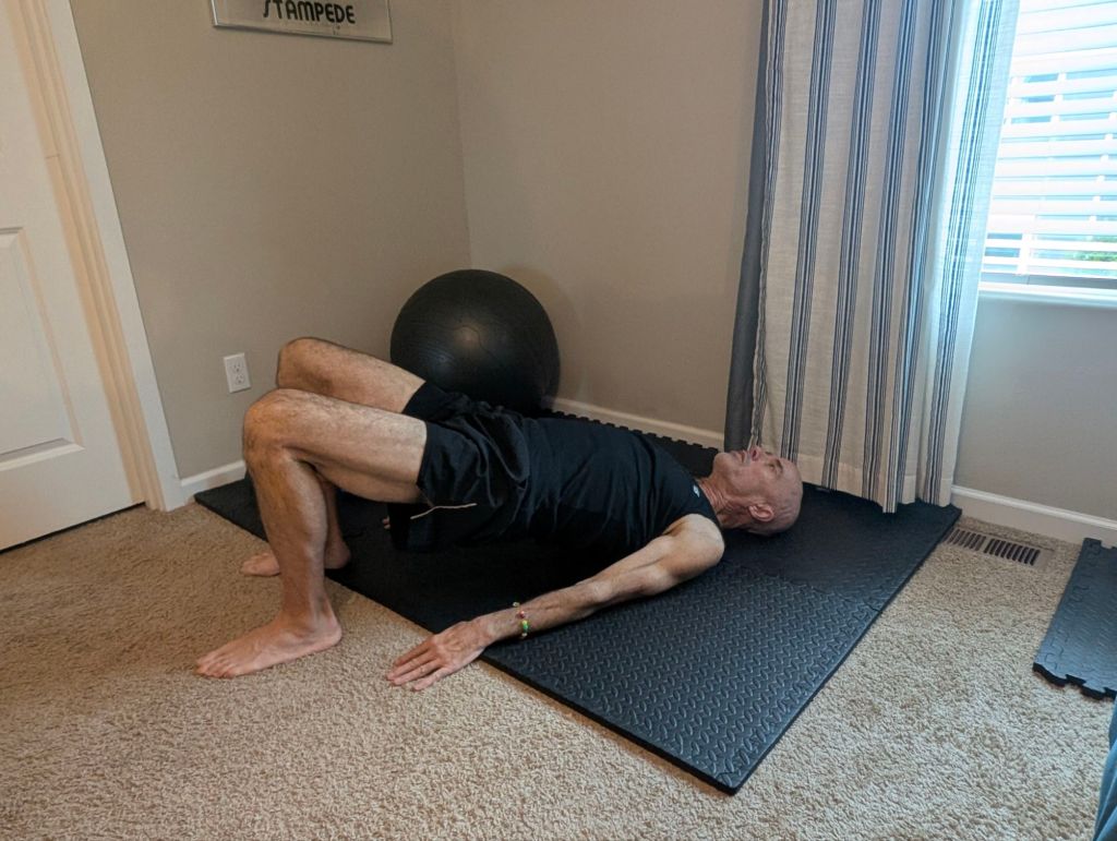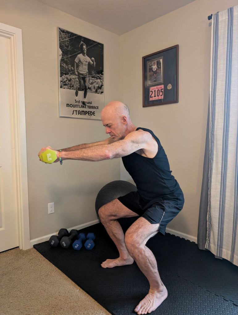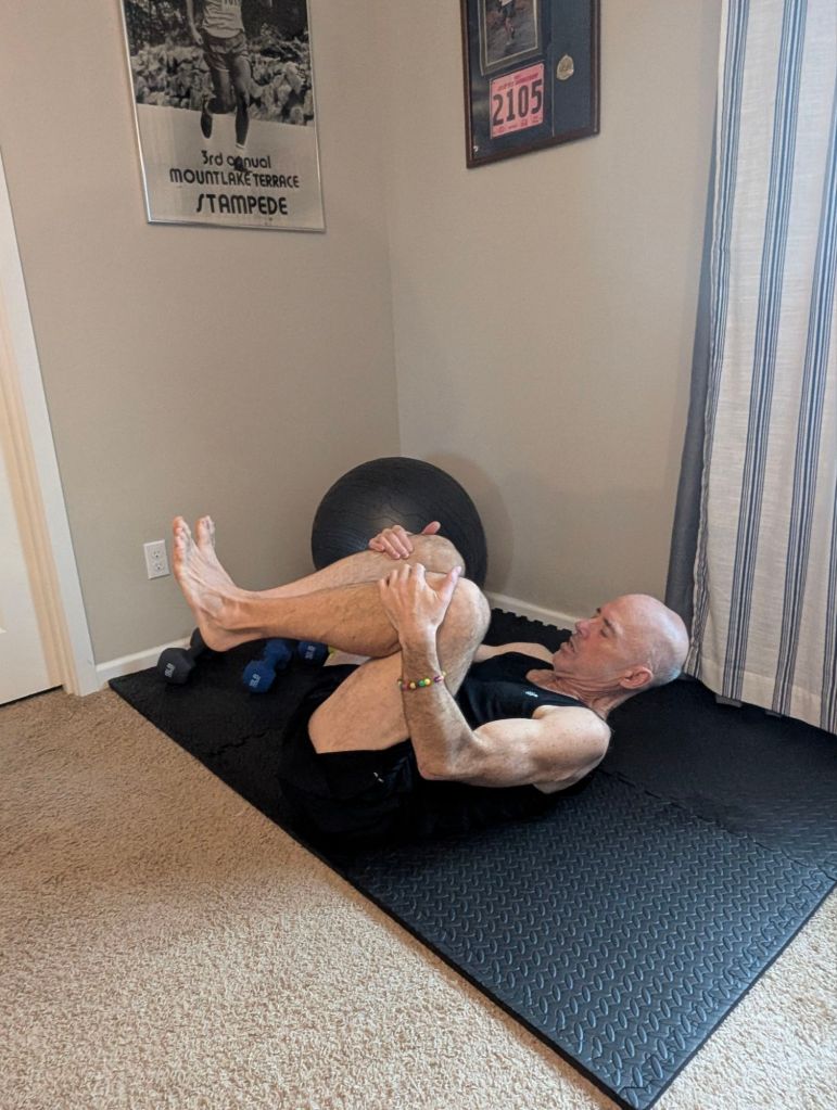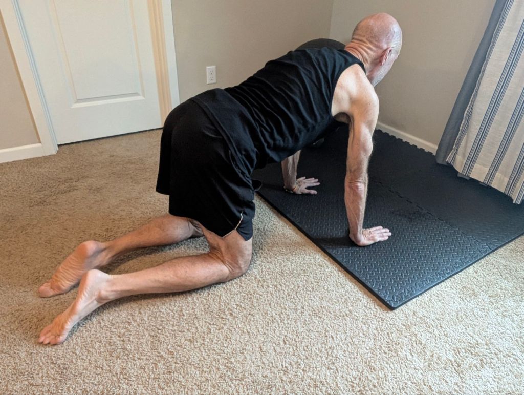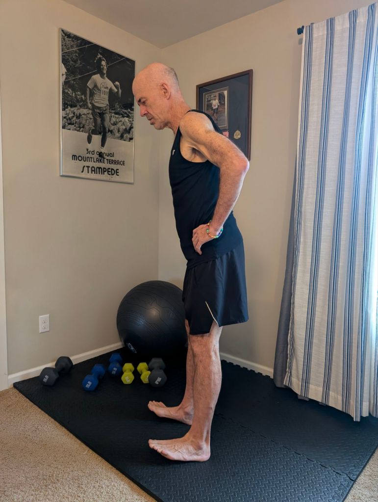 Many of these exercises combine those aims. flexibility and range of motion or balance and strength and so on. I will include photos of many of these exercises, but will attempt to describe them in words first to outline my routine. I attempt to do these things at approximately the same time as the power of habit, which I will detail later, makes all of this much easier and more sustainable.