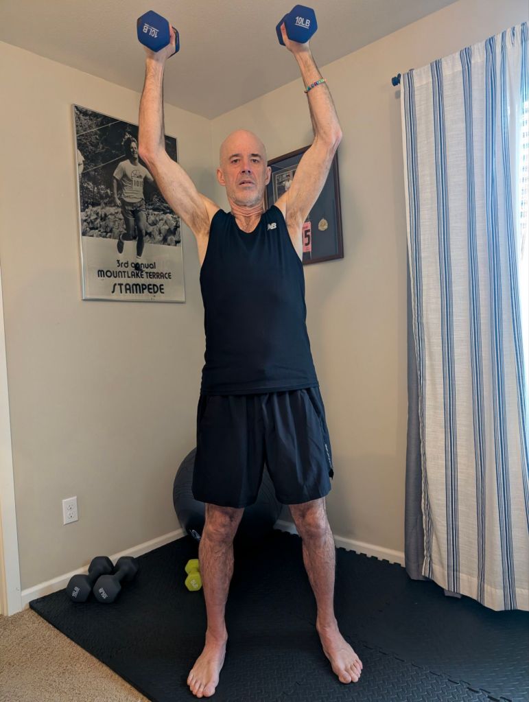 - 20 overhead presses with both arms together (strength and range of motion)