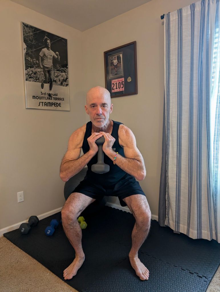 - three to five deep squats holding on to something (flexibility, strength. Range of motion)