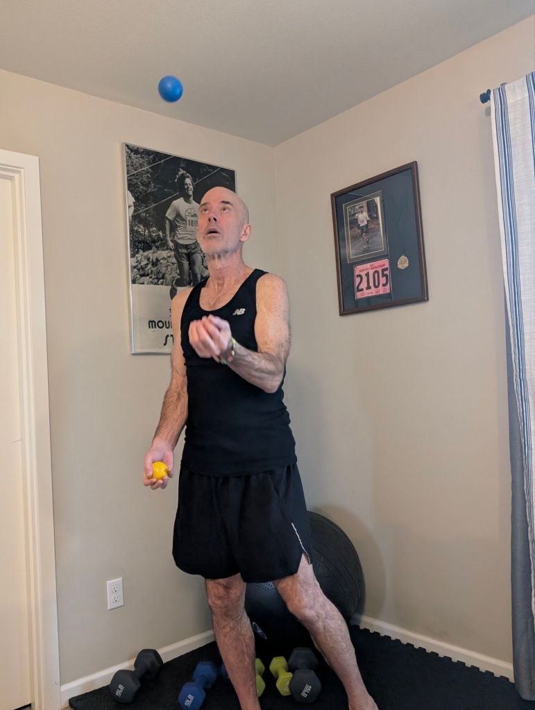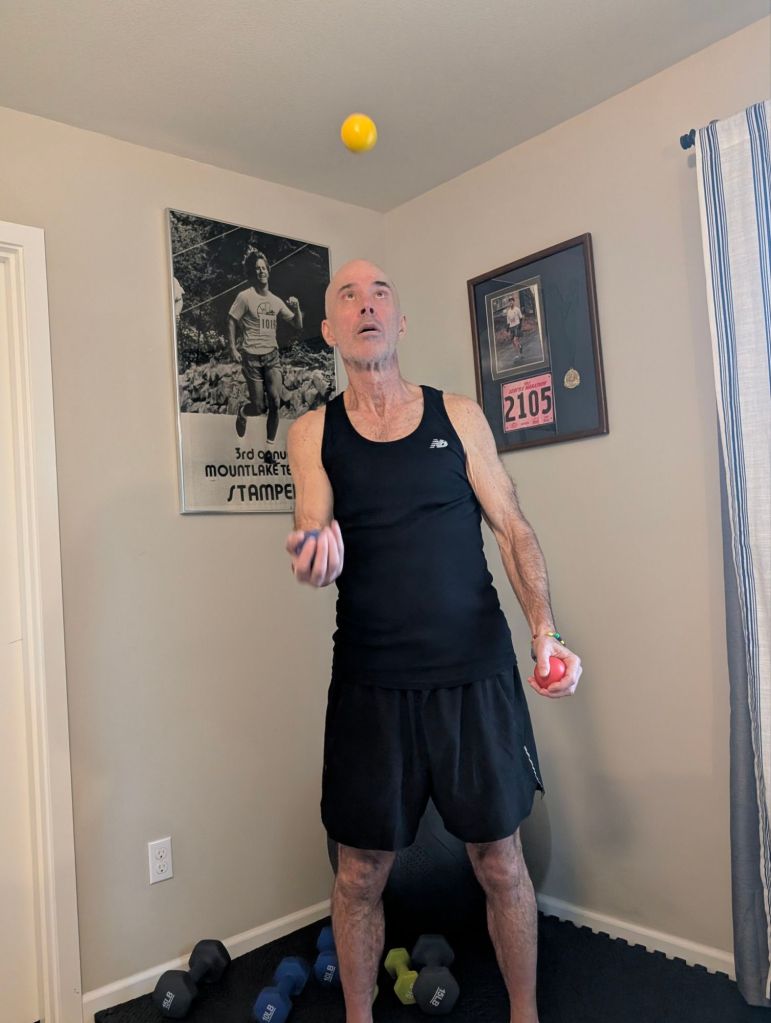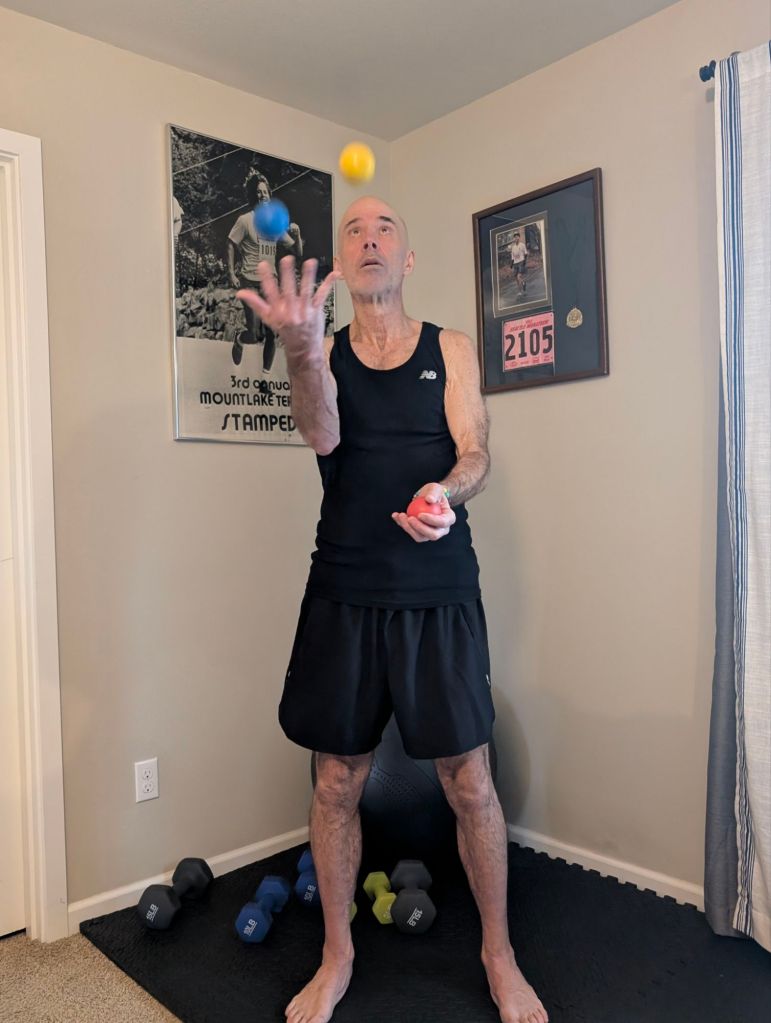 29. I have learned to juggle, so I juggle three lacrosse balls, typically doing at least 50 touches and then do 20 separately with each hand and two balls. This develops my coordination. Juggling is quite easy to learn via online tutorials. It seems impossible at first but is learned quickly.