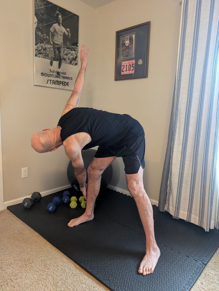 - Bend over at my waste with legs a couple of feet apart and touch the floor, walking my hands forward. Then I rotate and point with one hand up towards the ceiling, do this on both sides alternately and holding the position for 5 seconds or so. (flexibility and range of motion)