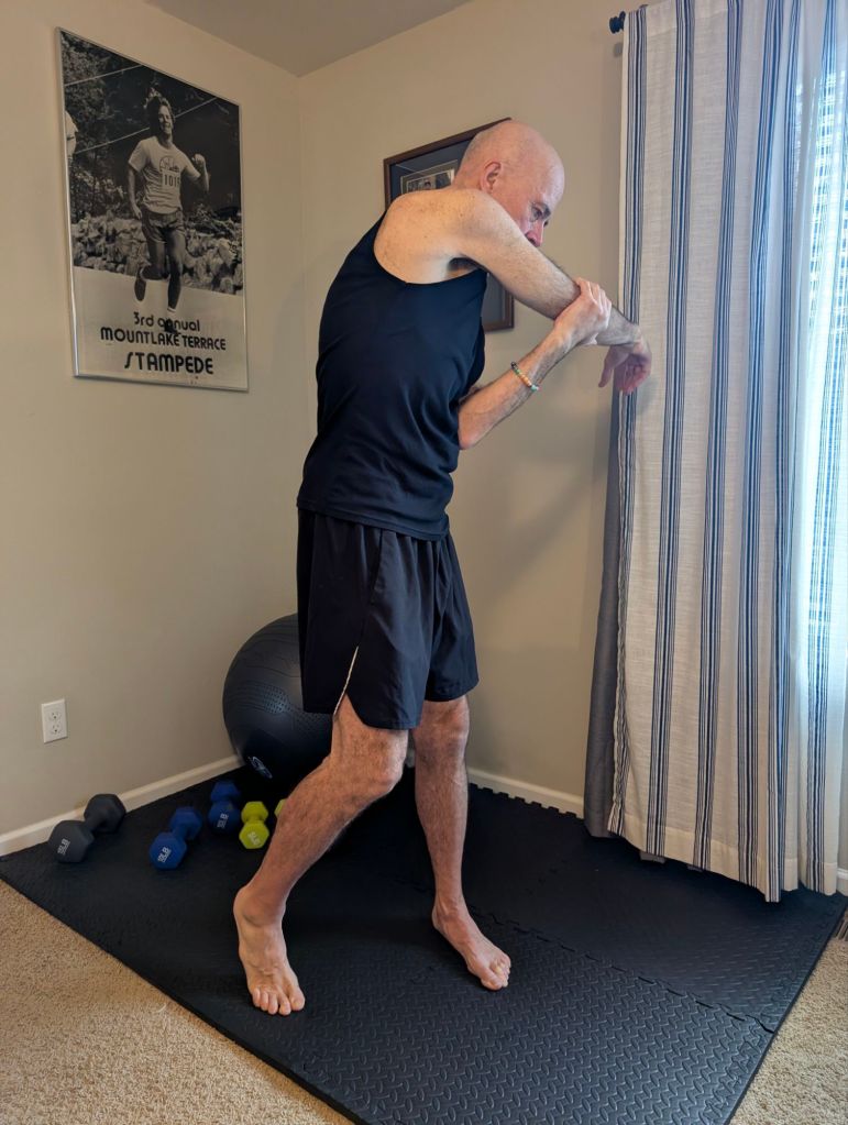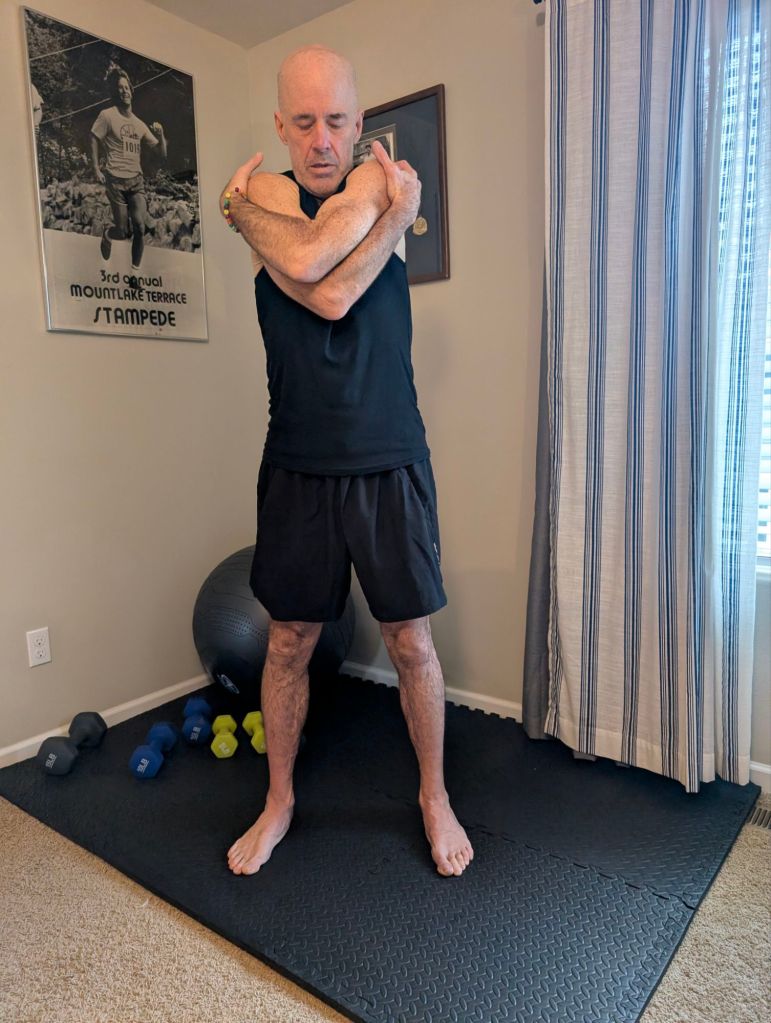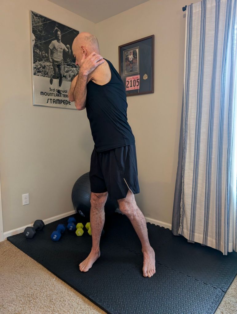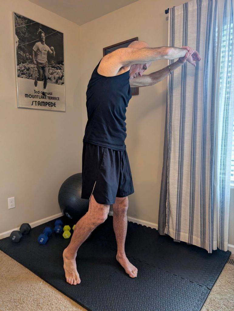 - then I do several stretches with my arms and shoulders (see photos), while also rotating at the waste to begin loosening up my lower and upper back.