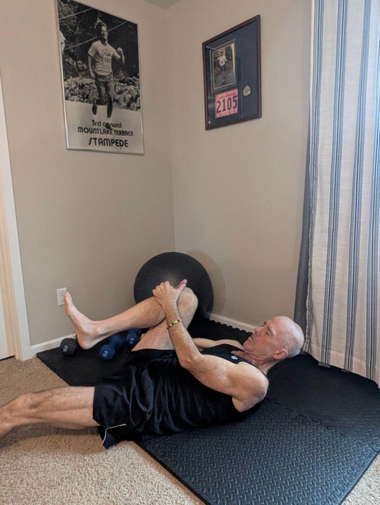 - Laying on my back I pull one leg at a time next to my chest. Do this alternating. Then pull both knees towards your chest.