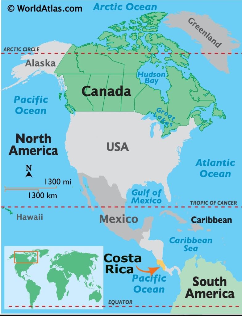 As you can see on maps, Costa Rica is a narrow, small country with coastlines in the Pacific Ocean and the Caribbean Sea. The East Coast has a lot of African and reggae influence and did even before it was trendy and cool Nicaragua lied to the North and Panama to the South. There are mountainous regions over 10,000 feet in altitude, rushing rivers that are now ecotourism destinations, rainforests and a wide variety of beautiful beaches. I can say that we were lucky to go there before it was “discovered.”