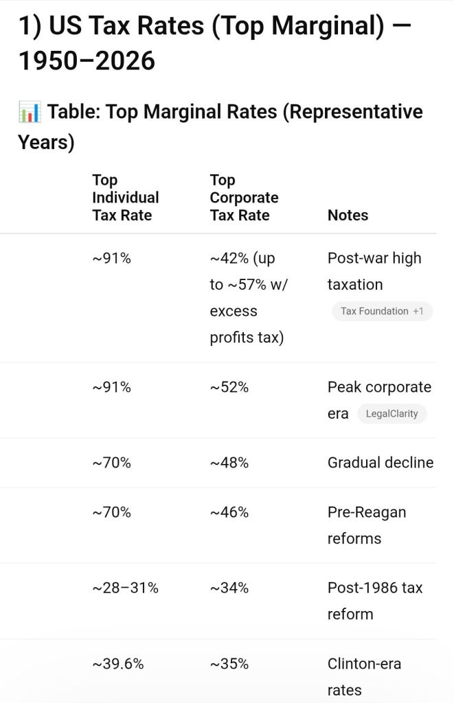 Below is a clean, data-driven summary (1950–2026, USA) using representative benchmark years (since yearly statutory structures are complex and bracketed).