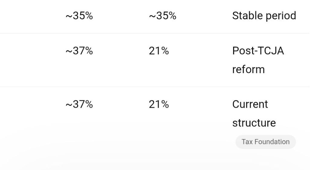 - Biggest structural break: Tax Cuts and Jobs Act (2017) → flat 21% corporate rate